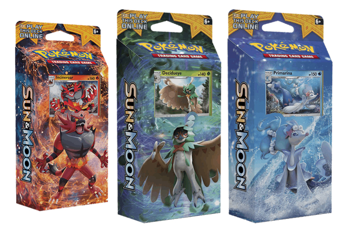 Welcome to the tropical Alola region! Choose your first partner—Rowlet, Litten, or Popplio—and begin your journey with three 60-card theme decks, each ready to play right out of the box. Take aim with the Forest Shadow theme deck, add fuel to the fire with the Roaring Heat theme deck, or overwhelm your foe with the Bright Tide theme deck!
