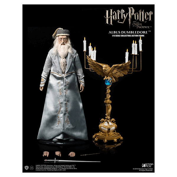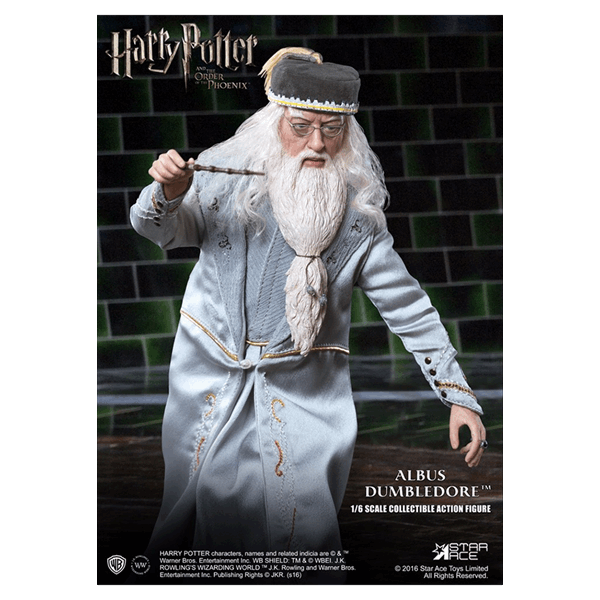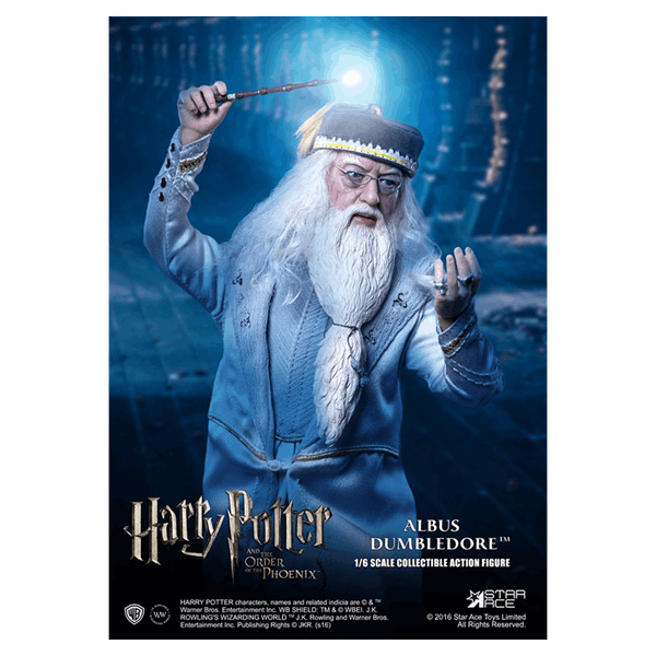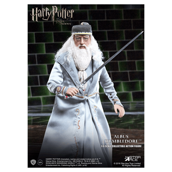 Sideshow and Star Ace are proud to present the Albus Dumbledore II Sixth Scale Figure as seen in Harry Potter and the Order of the Phoenix. This collectible figure features an authentic likeness of Michael Gambon as Albus Dumbledore complete with the Great Hall podium, his wand, and the sword of Gryffindor.