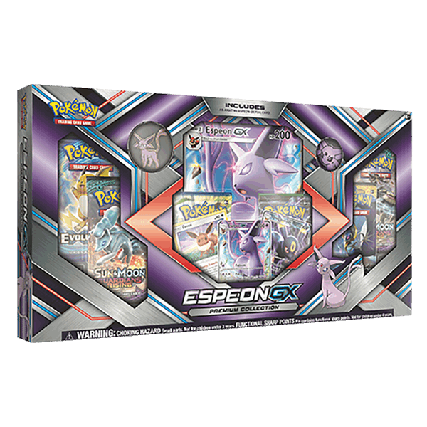 The Sun Pokémon Espeon and the Moonlight Pokémon Umbreon appear as powerful Pokémon-GX in these two Premium Collections! Each collection features the star Pokémon as an oversize Pokémon-GX card, collector’s pin, and Pokémon coin, and each collection includes three foil cards featuring Eevee, Espeon-GX, and Umbreon-GX. Shine on with Espeon, or welcome the moonlight madness with Umbreon!